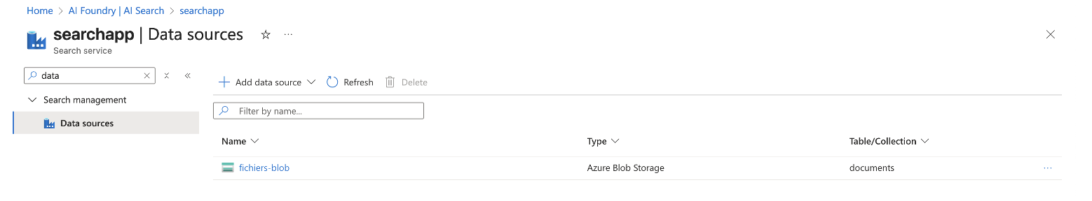 La data source est le connecteur entre Azure AI Search et votre container Blob. À ce stade, Search « voit » la source, mais ne sait pas encore quoi stocker ni quels enrichissements exécuter.